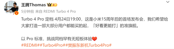 【MOBILE】Redmi官方今(21日)晨宣佈,全新性能旗艦Turbo 4 Pro確定將於4月24日晚間7點正式亮相,品牌總經理王騰在微博發文強調:「要以Pro級標準打造『好看更能打』的無短板準旗艦,重點是讓多數用戶都能輕鬆入手!」