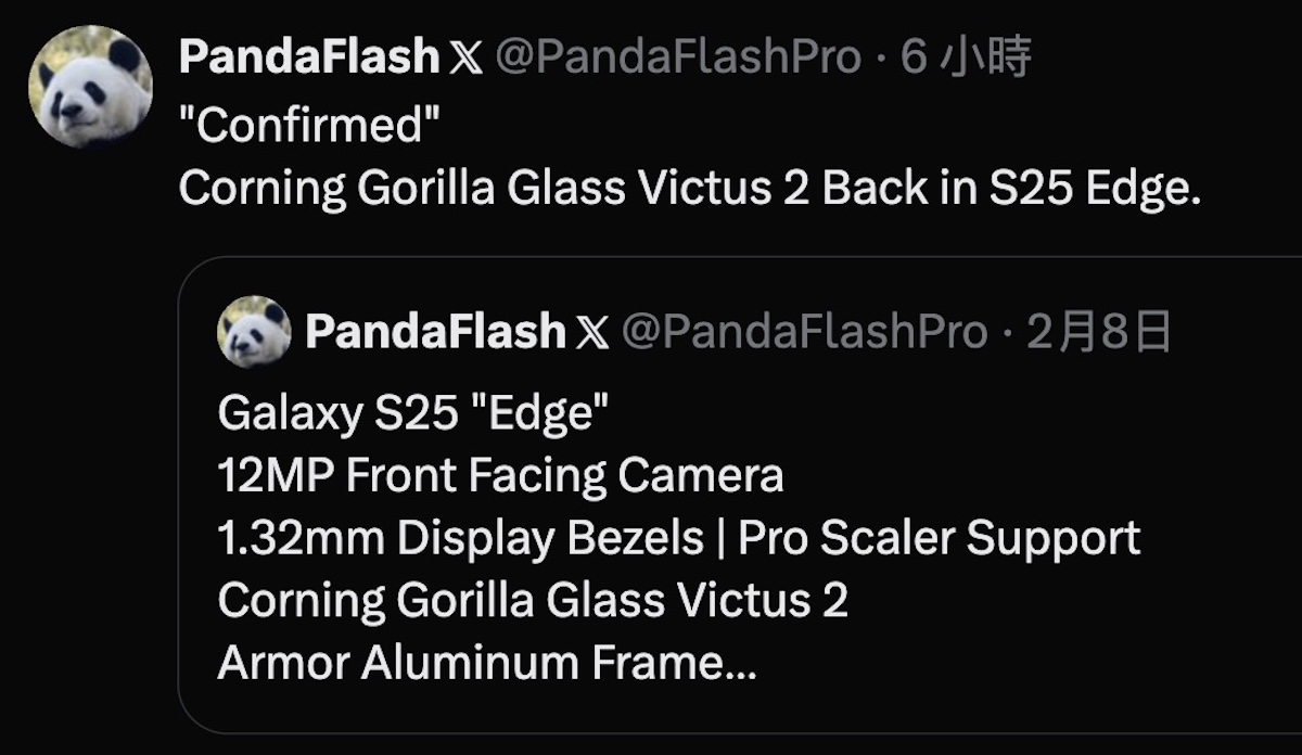 另外關於 S25 Edge 的螢幕部份,廠方似乎為其加回康寧的 Gorilla Glass Victus 2 強化玻璃,其堅韌度比此前流傳的 Gorilla Glass 更好。