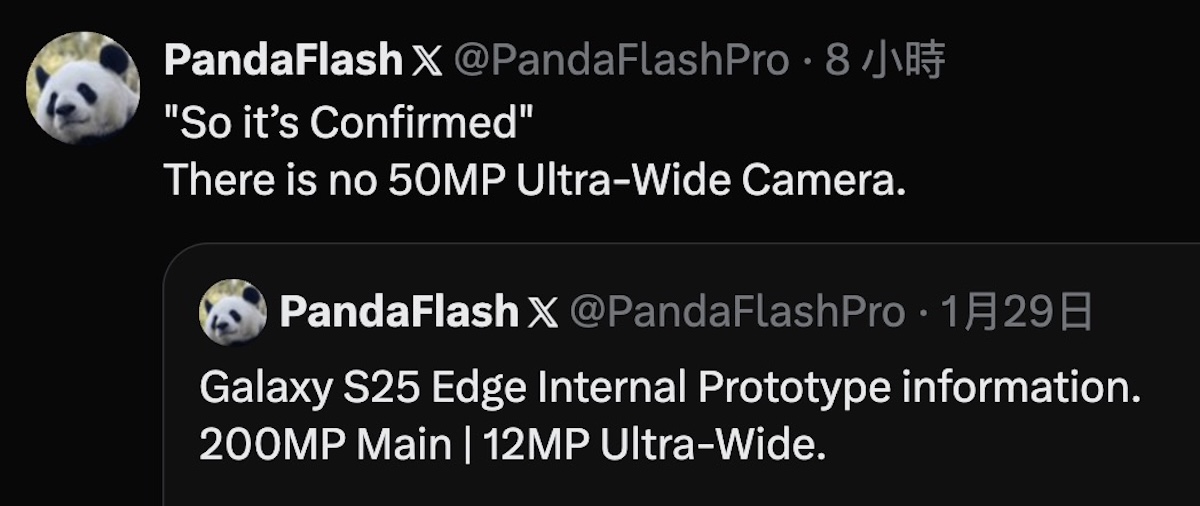 消息人士 @PandaFlashPro 在其 X 帳號透露,三星輕薄手機 Galaxy S25 Edge 似乎將配備 200MP 主鏡、跟 12MP 廣角組成的機背雙攝像模組。