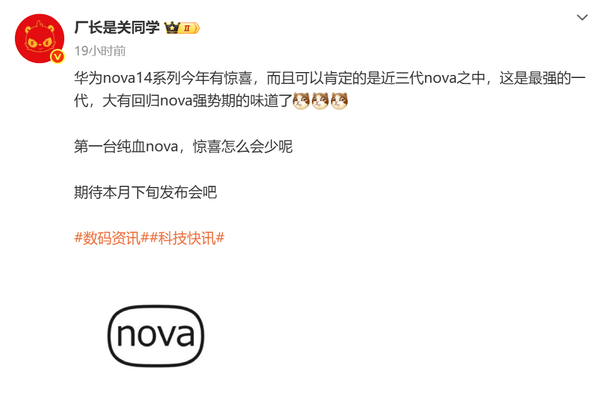 【MOBILE】據最新消息透露,HUAWEI 將於本月下旬正式發佈全新 HUAWEI nova 14 系列,預計推出三款機型,包括 HUAWEI nova 14、nova 14 Pro 及 nova 14 Ultra。而近日有接近 HUAWEI 的數碼博主爆料,此次 nova 14 系列將是首代「純血nova」,並強調其為近三代中最強的一代,性能與設計均有望回歸 nova 系列的強勢期!