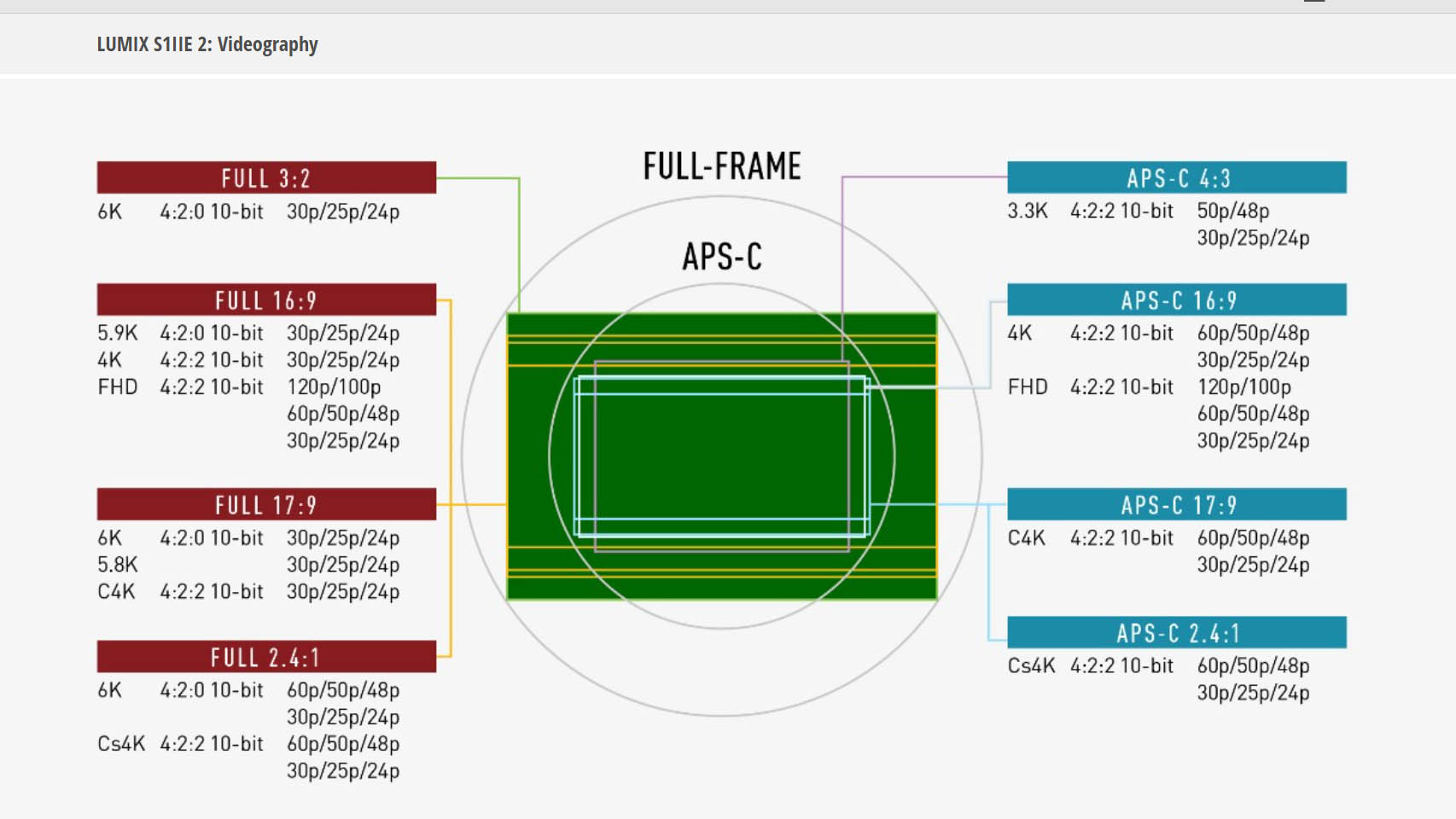 雖然用相同感光元件,但S1IIE比S5IIX多出約30種錄影格式,有2.4:1「電影比例」格式 6K/4K FF 60/50/48p錄製。礙於感光元件讀取速度的限制,open gate 3:2 最高格數和S5II系列一樣只有30p,16:9 4K 60p畫面拍攝會裁剪為APS-C。始終是高級系列,S1IIE支援「Cinelike A2」色彩設定、用CFexpress Type B 卡可以內錄ProRes RAW、Proxy 錄製、透過專屬 XLR 2 配件支援 32-bit 浮點音訊,亦兼容部分藍牙Timecode同步裝置與 LUMIX Flow 應用程式,最適合多機分鏡同步拍攝。