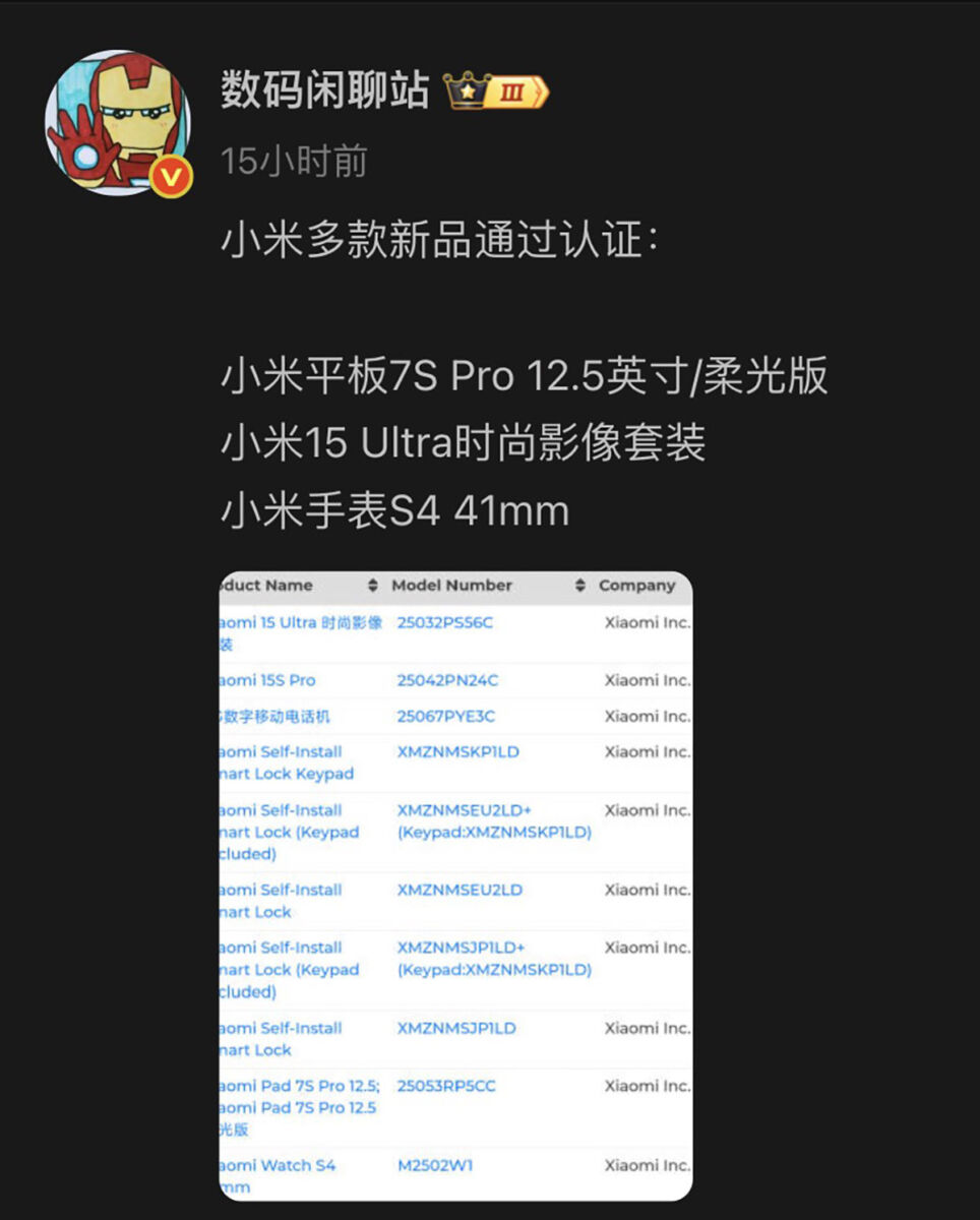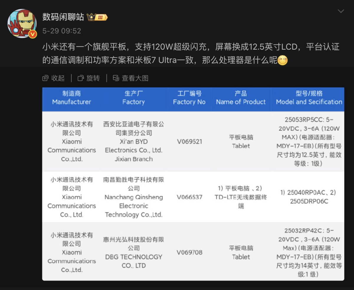 國內爆料達人「數碼閒聊站」早前展示了已獲國內認證的多款小米產品圖表,其中包括了型號為 25053RP5CC 的 Xiaomi Pad 7s Pro 12.5 標準及柔光版。