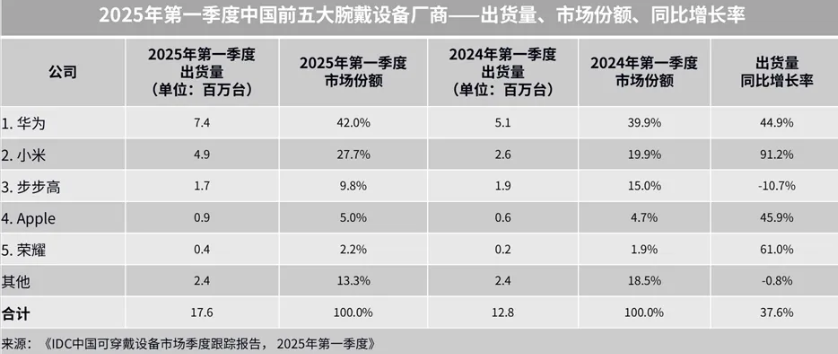 中國智能手錶市場出貨量達1,140萬台,增長25.3%。手環市場增速更為強勁,全球出貨量1,076萬台,同比增長34.0%,其中中國市場貢獻621萬台,暴漲67.9%。