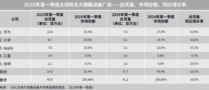 HUAWEI 在2025年第一季度成功躋身全球腕戴設備市場第一位,同時在中國市場保持領先地位。其鴻蒙生態的協同效應逐步釋放,跨設備互聯能力進一步強化用戶黏性。今年初推出的 HUAWEI Band 10 在全球熱銷,帶動整體出貨量攀升。