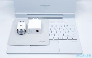 開箱飛天青色款 MatePad Pro 12.2″ 包裝提供 SuperCharge 充電器(港版現貨將提供英式三腳頭版本)、數據線及 HUAWEI 星躍鍵盤。