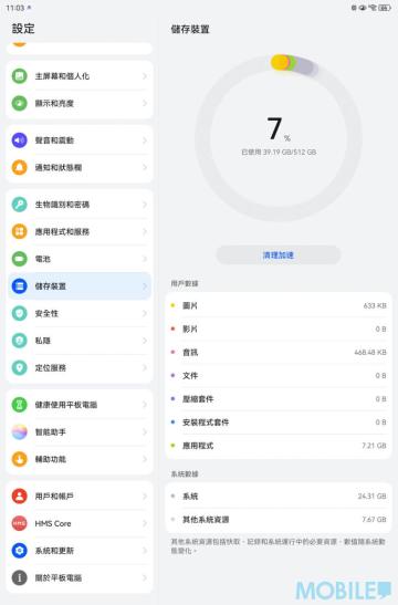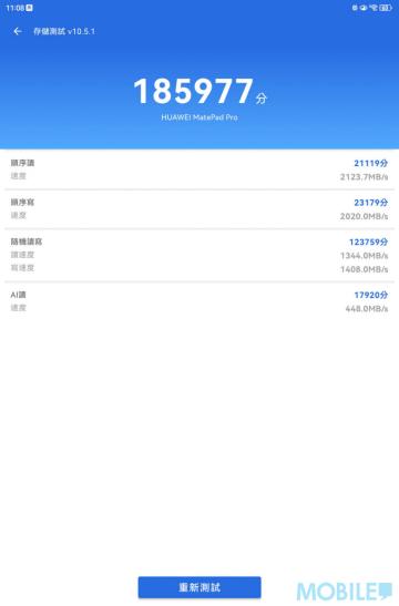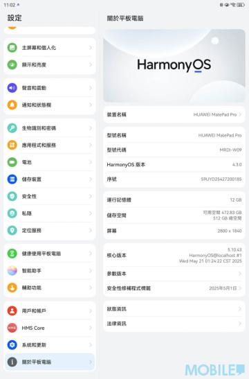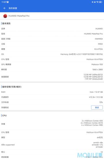 港版 MatePad Pro 12.2″ 預載 HarmonyOS 4.3 系統,512GB 儲存容量充足、在《Antutu》儲存測試表現不錯;螢幕選項則支援 P3 色域跟智能 144Hz 更新率。
