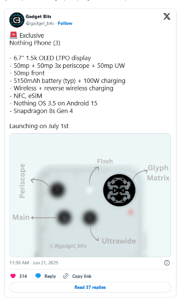 爆料同時附上一張模糊的機身背面圖片,隱約可見相機模組設計略有調整,但具體變化仍有待官方揭曉。距離 Nothing Phone (3) 正式發佈僅剩約一週時間,若無意外,這將是發佈前最完整的規格曝光。