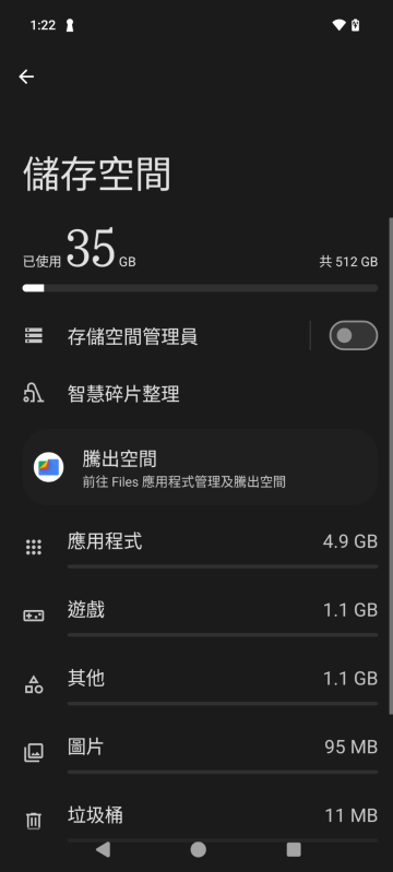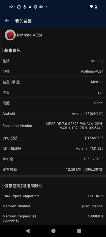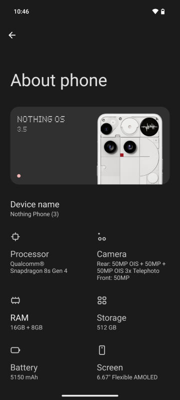 此外,Nothing Phone (3) 搭載 Nothing OS 3.5 並基於 Android 15 系統,今次測試的是最高的 16GB + 512GB RAM 版本,扣除 Nothing OS 後用戶仍有 477GB 空間供用家使用。而 Nothing OS 採用黑色主題的介面設計,與 Andoid 原身介面有點相似。