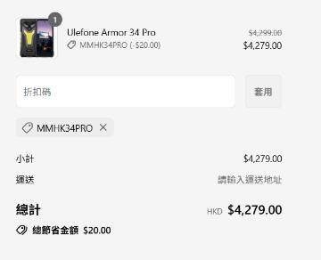 Ulefone Armor 34 Pro 將於即日上市,建議零售價為$4,299。而透過以下連結購買 Ulefone Armor 34 Pro 於交易付款時可額外享有$20的折扣,變相可以以$4,279就可入手!