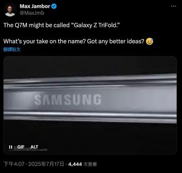 關於 Samsung 三摺屏新名稱消息,由爆料達人 Max Jambor 較早前在其 X 帳號(@MaxJmb)提出,指代號 Q7M 三星裝置或以 Galaxy Z TriFold 命名。