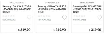 至於Galaxy A17 5G 版本,同配置(8 + 256GB)售價則為 319.9 歐元(折合約 2911 港元),提供黑、藍、灰三色選擇。值得留意的是,兩款機型極可能推出其他RAM與儲存組合,且不排除會有更多顏色選擇。