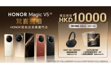 由即日起至 8 月 13 日間,在指定商號預購 HONOR Magic V5 手機,即送包括 SONY WH-1000MX5 耳機及豐富保修服務等優惠,總值達港幣 $10,000。