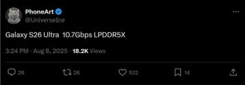 【MOBILE】著名 SAMSUNG 爆料達人 Ice Universe 近日於社交平台X發文,透露即將推出的Galaxy S26 Ultra 將配備 10.7Gbps LPDDR5X 記憶體,與前代 Galaxy S25 Ultra的規格相同。不過,目前尚未確認記憶體容量會否升級,畢竟自 2020 年 Galaxy S20 Ultra 推出以來,SAMSUNG 旗艦機一直維持 12GB RAM 的配置。