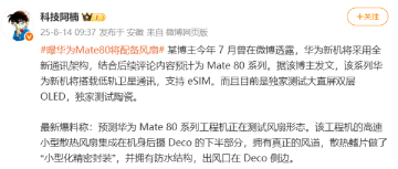 據可靠消息透露,Mate 80 系列有望在今年 10 月正式亮相,該系列將首發搭載 Kirin 9030 旗艦處理器,並首次實現低軌衛星通訊技術的民用化,同時還將支持 eSIM 等通訊技術。