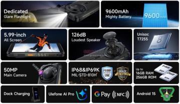 在核心硬體配置方面,Ulefone RugKing 採用 Unisoc T7255 處理器作為運算核心,搭配 8GB LPDDR4X 記憶體與 256GB UFS 2.2 儲存空間,更提供高達 2TB 的 microSD 卡擴充能力。系統方面將預載最新 Android 15 作業系統,不過官方目前尚未公布具體的系統更新支援政策。
