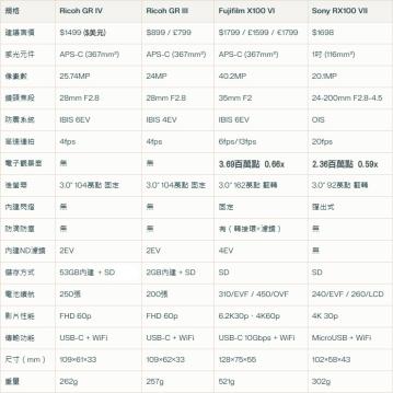 Ricoh GR IV 與 Fujifilm X100V、Sony RX100 VII 大比拼: