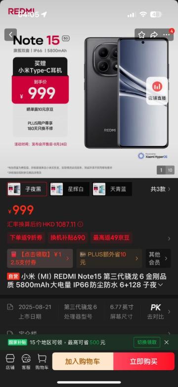 好消息是港人用家亦有機會能第一時間入手 REDMI Note 15 國行版,京東港澳 App 小米自營店已上架該作,標配 6+128 包郵到港價約 $1,087.1 千一有找。