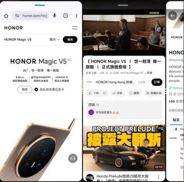【MOBILE】一部摺疊屏幕,如何同時駕馭工作、娛樂與社交,從此不再需要頻繁切換畫面?HONOR Magic V5 的「一開三屏」功能,真正實現一部手機同時開啟三個應用程式,流暢並行操作,讓你不錯過任何重要內容,效率與體驗全面升級。