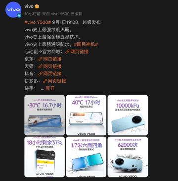 本文刊登時 vivo 已透過官方微博帳號等渠道,確定將於 9 月 1 日(下週一)發表 Y500 手機,並以 8,200mAh 超大電池作為主要賣點之一。
