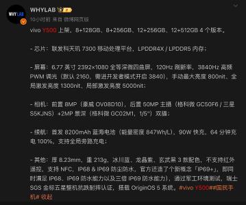 數碼博主「WHYLAB」透露了 Y500 配置,其配備天璣 7300 晶片、6.77 吋 FHD+ 等深四微曲屏,機背 50MP 主鏡配 2MP 景深雙攝,厚 8.23mm 機重 213g。