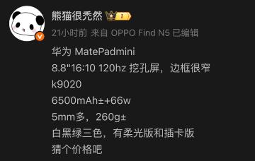 硬件配置部份,據數碼博主「熊貓很禿然」透露,HUAWEI MatePad Mini 將配備 16:10 比例 120Hz 更新率 8.8 吋 OLED 開孔屏,窄邊框設計將帶來更高屏佔比。