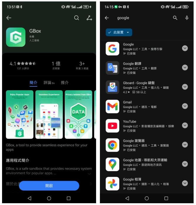 Mobile Magazine 短評:除經 GBox 內 Google Play 商店下載 App,部份 Google 程式如 Gmail 跟 Chrome 瀏覽器,可直接在 AppGallery 搜尋及安裝。