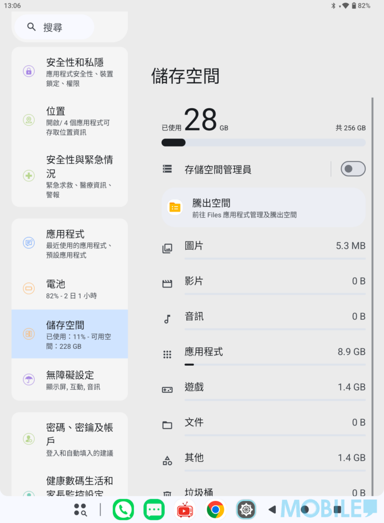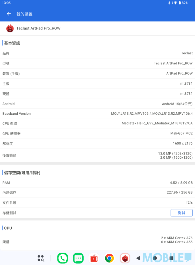 搭載 MediaTek Helio G99 處理器、Mali-G57 MP2 GPU 及 8GB RAM,日常操作流暢,多任務切換未見不順暢情況,可應付輕度遊戲。儲存空間為 256 GB UFS 2.2,支援 microSD 擴充最高 1 TB,或雙 nano-SIM 卡(4G 上網)。與同價位 iPad 11 或 Xiaomi Pad 7 相比,性能略遜一籌,但對於文書、影音或繪圖等需求仍足夠。