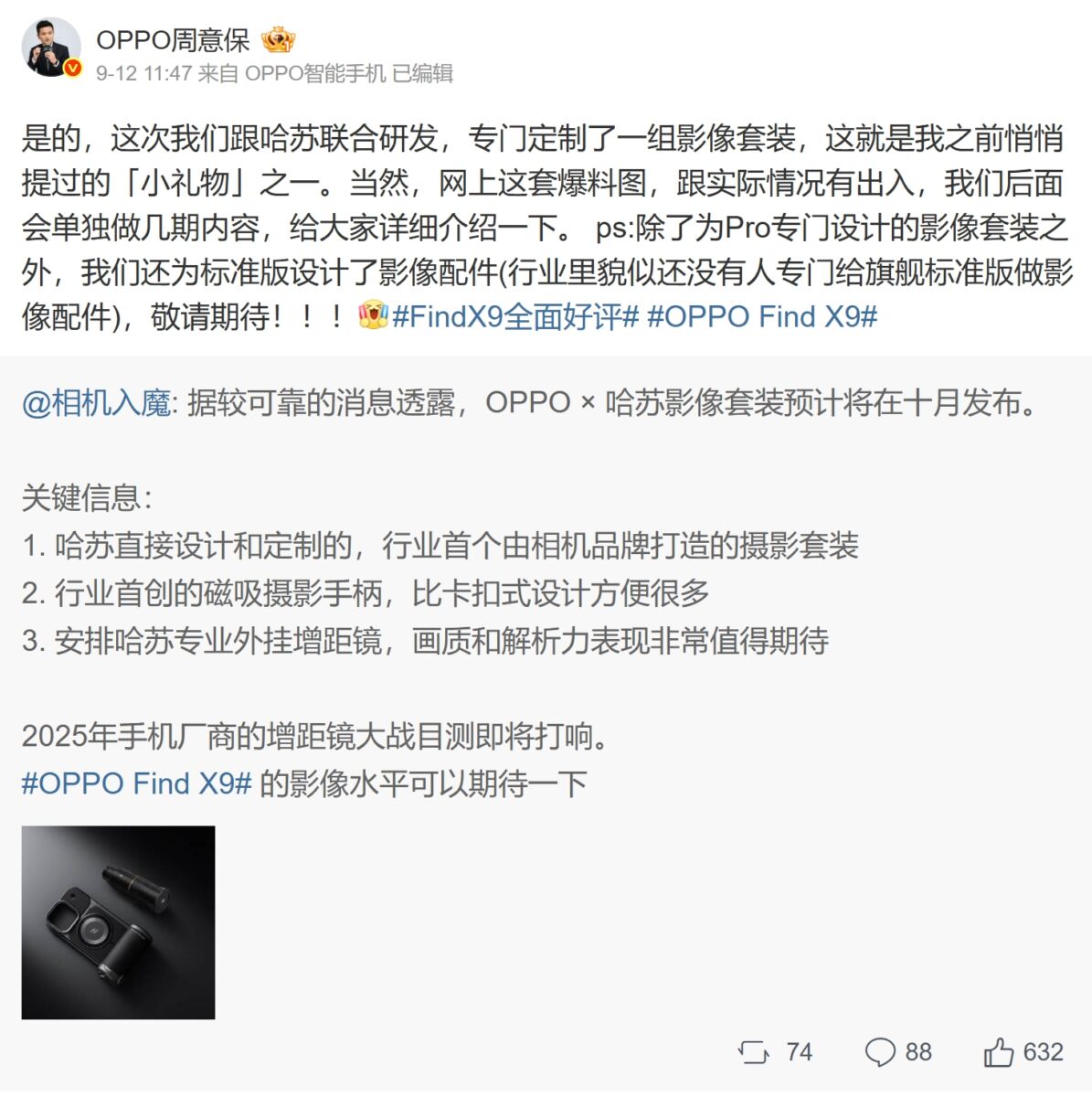 【MOBILE】近日 OPPO Find 系列產品負責人周意寶於微博上透露,即將推出的旗艦新機 OPPO Find X9 Pro 將配備一款專屬的哈蘇影像套件,不過需要另外購買。值得注意的是,周意寶特別強調,此前網絡上流傳的渲染圖並非最終設計,實際的影像套件外觀將會有所不同。