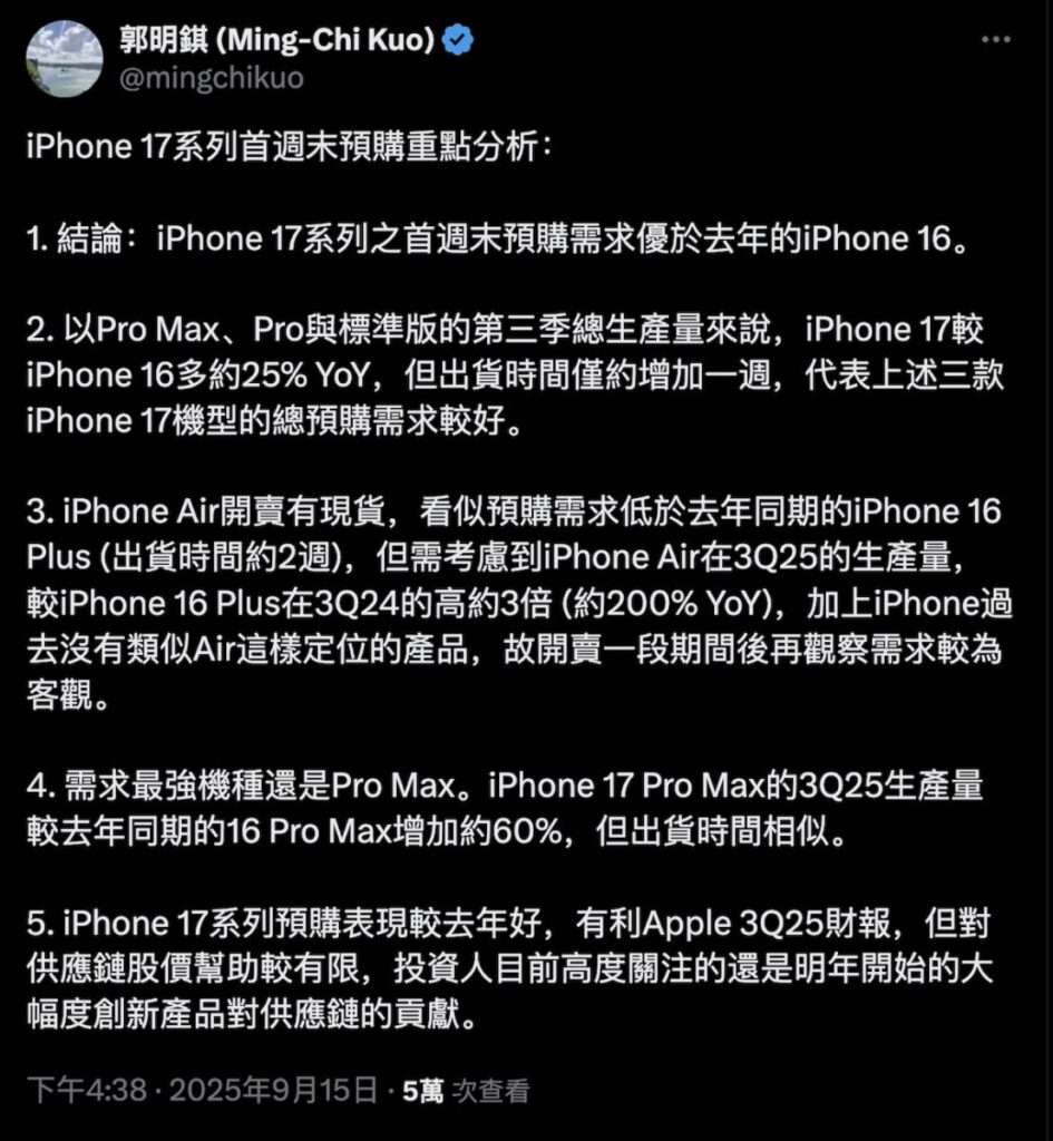 據知名分析師郭明錤在 X 帳號(@mingchikuo)透露,iPhone 17 系列最受歡迎機種仍為 iPhone 17 Pro Max,其 25 年第 3 季產品較去年同期高出達 60% 之多。