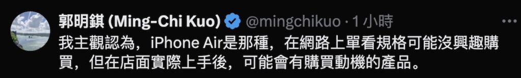 郭氏在另文亦指出,相比「簡報式」在網絡單看規格,iPhone Air 或更偏向用家在店面上手實機後,會因正式體驗而有購買動機的黑馬產品。