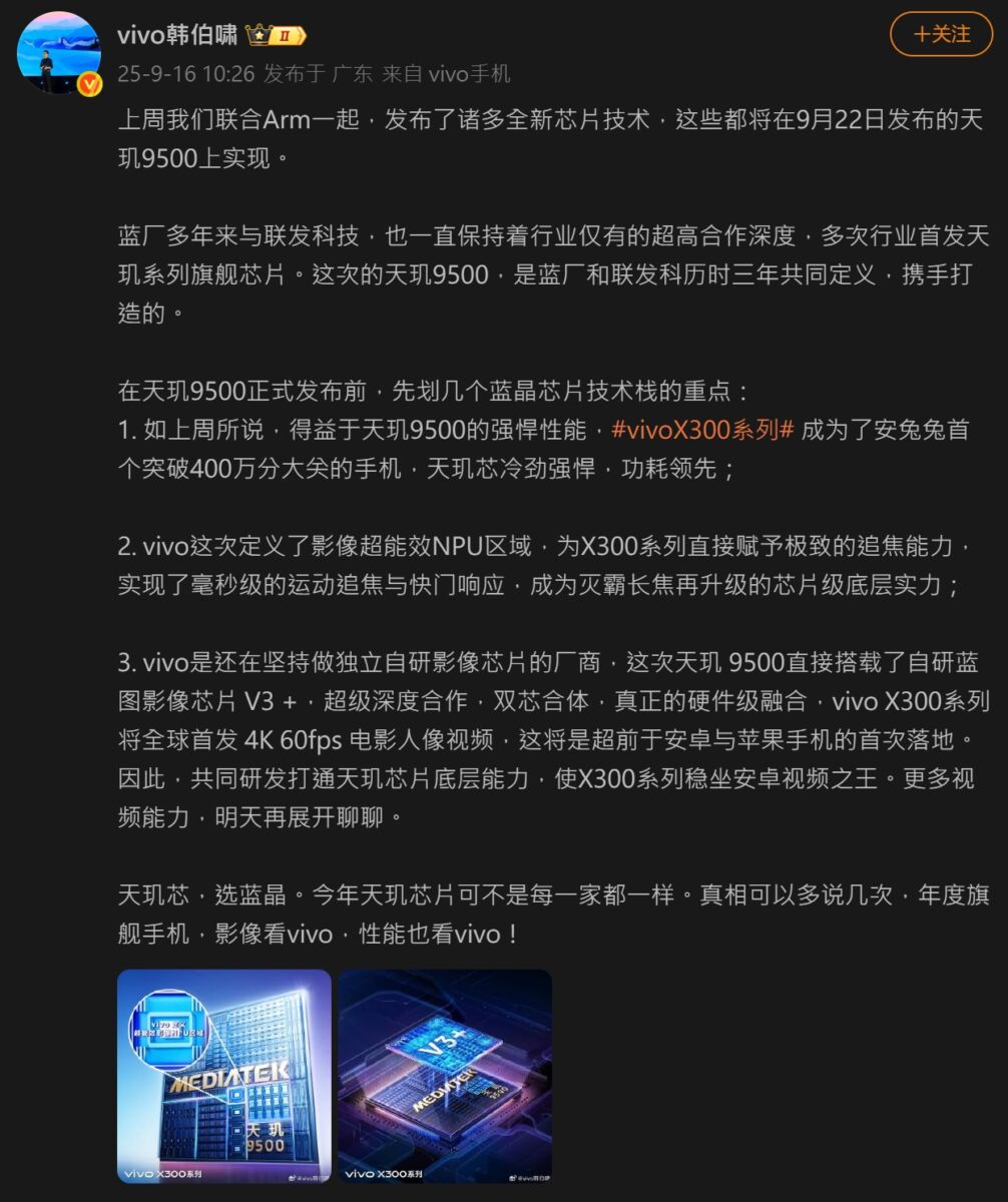 韓伯嘯上週分享的安兔兔跑分截圖顯示,天璣 9500 助 vivo X300 系列成為首款突破 400 萬分大關的手機,性能表現創下歷史紀錄。此外,X300 系列還將帶來多項突破性規格,例如頂規型號 X300 Ultra 會率先配備雙 2 億像鏡頭,成為全球首款雙兩億像攝影旗艦。