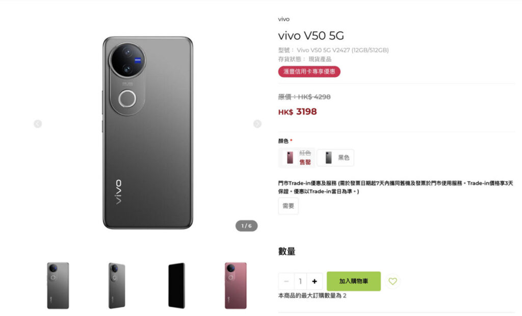 是次 vivo V50 5G 優惠由衛訊香港官方網店提供,其以優惠價 $3,198 開賣(原價 $4,298),本文刊登時黑色款 12+512 配置尚有庫存。