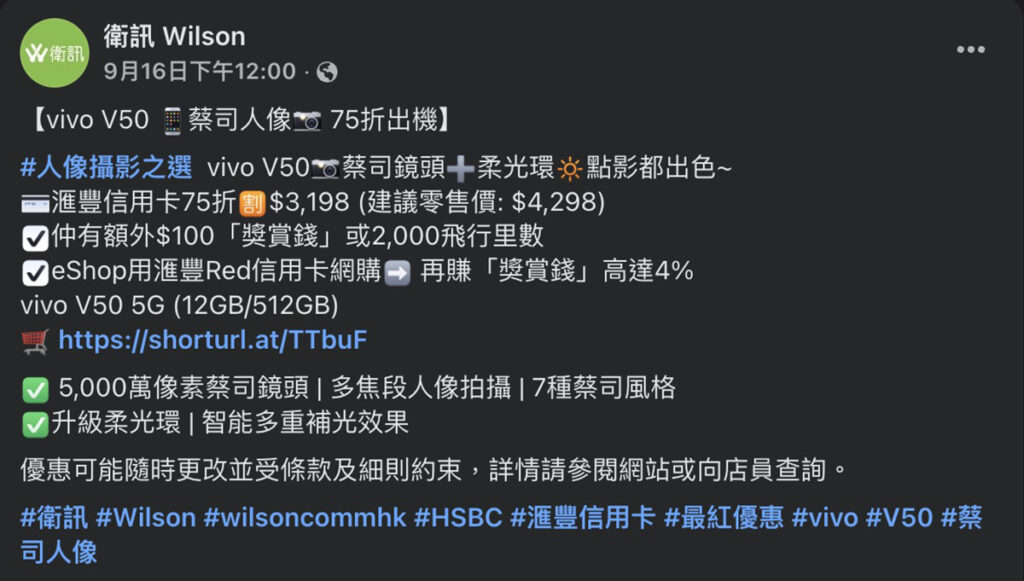 據衛訊香港 Facebook 專頁資訊,需以指定信用卡簽賬方可以優惠價入手 vivo V50 5G 手機,在 eShop 購買更享賺外回贈。