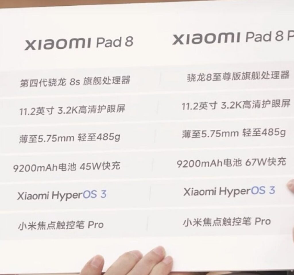 預計兩機均內置 9,200mAh 電池,其中 Pro 版會採用 67W 快充、標準版 Xiaomi Pad 8 則對應 45W 充電;另外兩機將支援全面升級的小米焦點觸控筆 Pro。