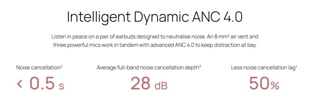 這項先進的降噪系統帶來三大突破性提升,僅需 0.5 秒即可極速啟動降噪功能,實現更全面的平均全頻段降噪深度,同時將降噪延遲大幅降低 50%。此外,憑藉 AI 通話降噪技術,即使身處高達 90dB 的嘈雜環境中,依然能夠保持清晰穩定的通話品質。