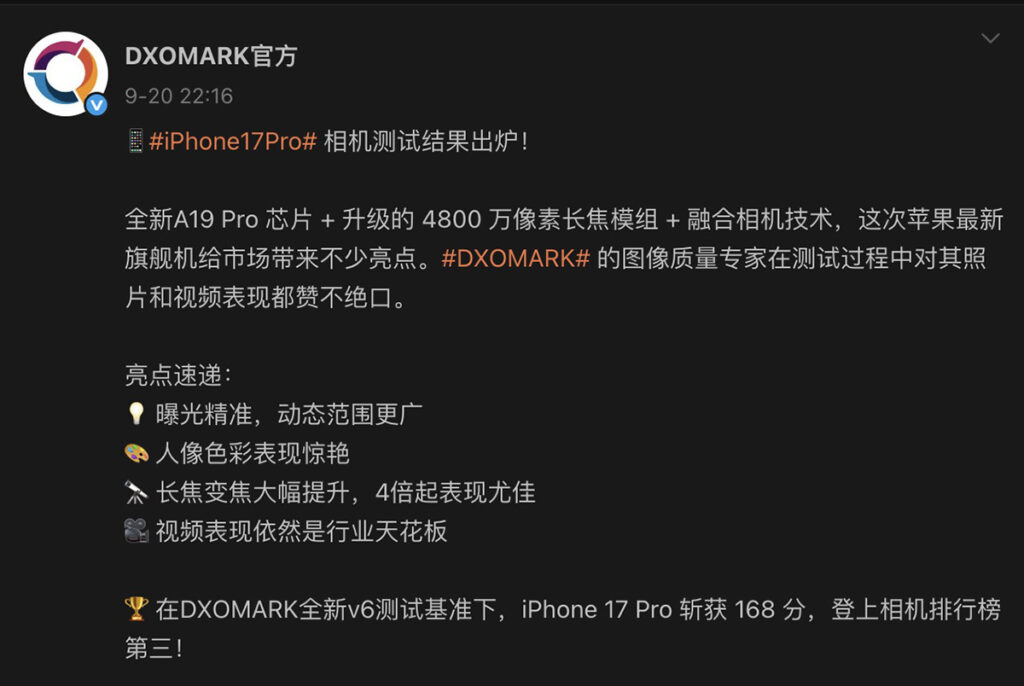 據 DxOMark 公佈資訊,iPhone 17 Pro 在相機項目獲 168 分、總榜排名第三,僅次於 HUAWEI Pura 80 Ultra(175 分)及 OPPO Find X8 Ultra(169分)。