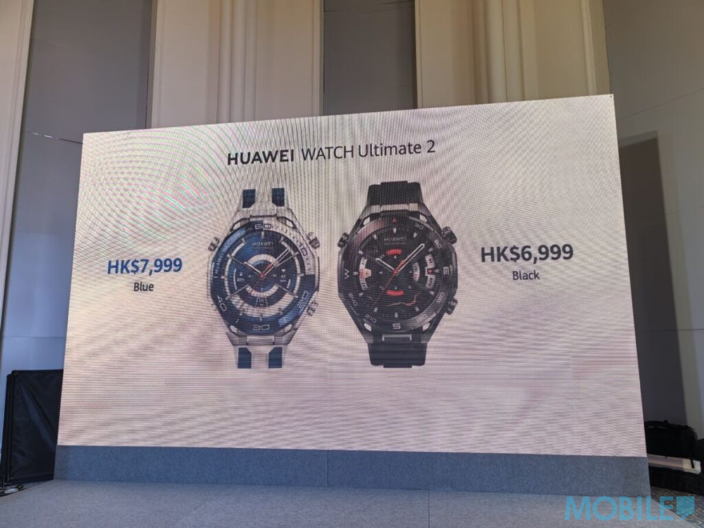 HUAWEI WATCH Ultimate 2 正式在港澳地區上市,蒼穹黑版本配黑色氟橡膠錶帶定價港幣 6,999 元;蔚海藍版本配藍白雙色氟橡膠錶帶及鈦金屬錶帶定價港幣 7,999 元。