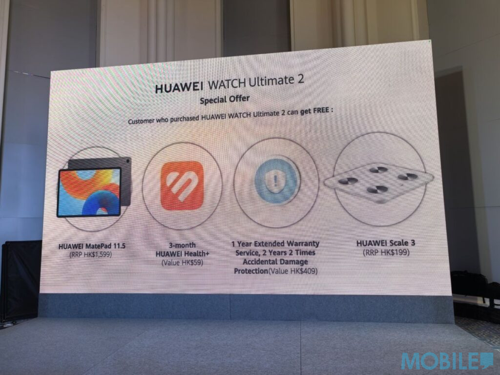 凡於指定零售商及運營商選購全新 HUAWEI WATCH Ultimate 2 之港澳原廠行貨,即享多重豪華贈品,包括 HUAWEI MatePad 11.5 平板電腦、三個月 HUAWEI Health + 會員體驗、HUAWEI Care+ 延長保養及意外保險,以及 HUAWEI 智能體脂磅,總價值超過港幣 2,000 元。