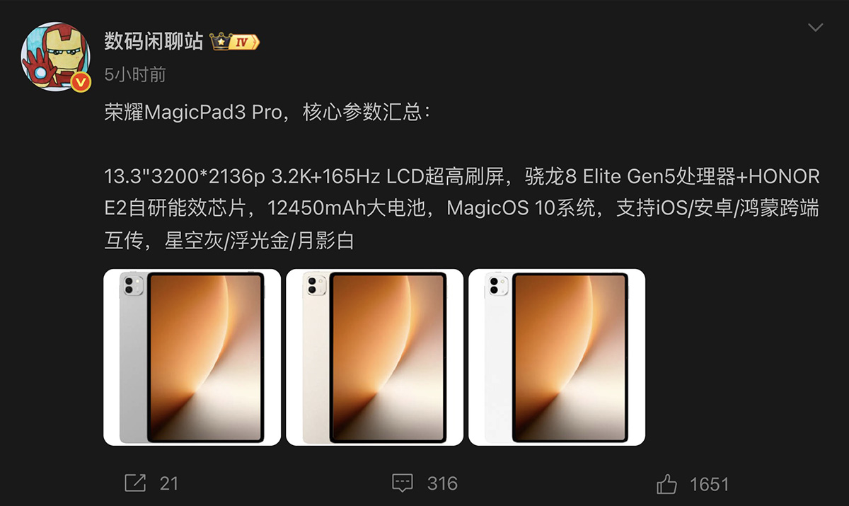 稍早前 HONOR 平板與 IoT 產品領域總經理,已透過「榮耀平板利用哥」官方帳號,為前文 MagicPad3 Pro 13.3 規格背書,簡接承認相關規格為真。