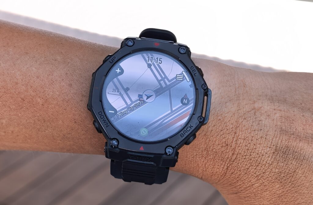 Amazfit T-Rex 3 Pro 最大亮點是新增智能路線規劃功能。實測過程中,我們預先為手錶下載全彩離線地貌圖,開啟地圖應用程式後,只需輸入前進方向與目標距離,或選擇內置的 POI 興趣點,系統便自動生成行山、跑步或單車訓練路線。啟動導航後,手錶提供清晰的轉向提示,並透過內置喇叭進行語音提醒。若偏離原定路線,系統會即時重新規劃,大幅降低迷路風險。