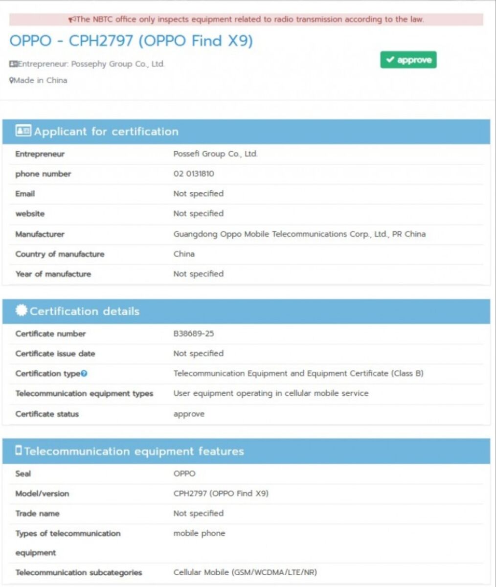 【MOBILE】OPPO Find X9 系列將於 10 月 16 日正式亮相。就在發表會前夕,該系列兩款主力機型”標準版 Find X9″ 與 “高階版 Find X9 Pro” 已正式通過泰國 NBTC 認證,其官方型號也隨之曝光,分別為 CPH2797 與 CPH2791,這意味著新機的上市準備已進入最後階段。