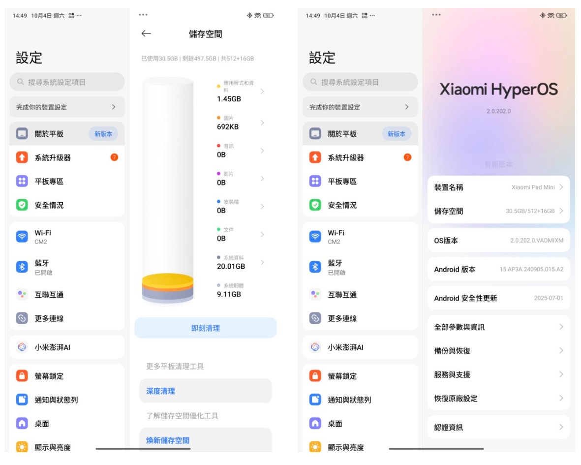 ▲ 小米 Pad Mini 預載 ANDROID 15 版本,試用 512GB 機型啟動後仍有 497GB 空間供用戶使用。