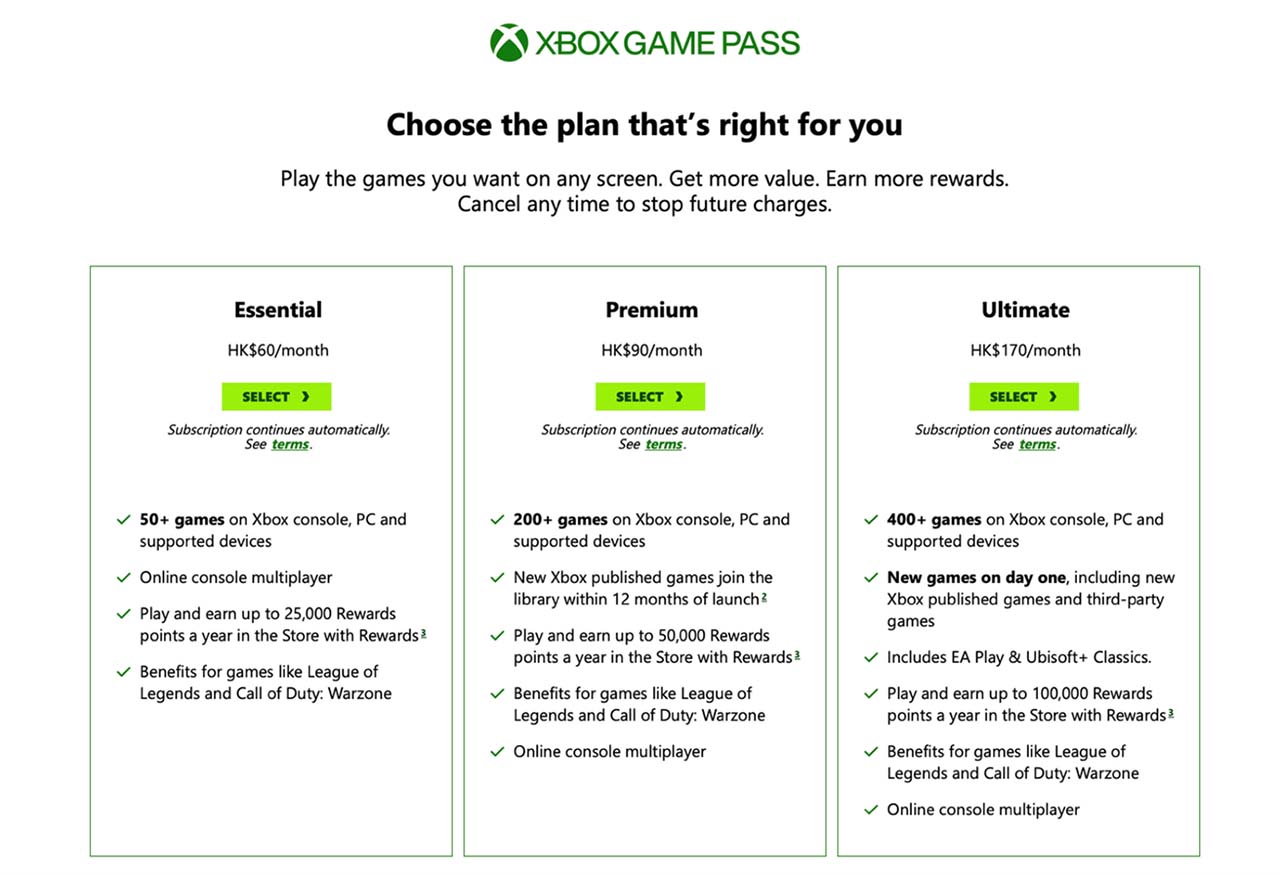 今次改動,主要是因為 Xbox Game Pass 過去的基本計劃包含的內容太過豐富,令 Microsoft 的遊戲部門收入不足以應付遊戲軟件開發商的分帳,而長期虧蝕。今次改版將原有的計劃重新分配,Core 計劃改為 Essential,只能玩推出一年以上的舊遊戲,月費港幣 60 元;Standard 版改為 Premium 版,月費港幣 90 元,可以玩一年內推出的遊戲;而最多人用的 Ultimate 版本,可以玩到最新的首發遊戲,每年大約有 75 隻,而且包括了 Ubisoft Plus Classics 和EA Play 遊戲,但月費就變成了港幣 170 元。