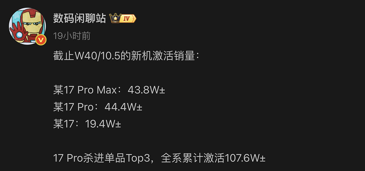 相關資訊來自爆料達人「數碼閒聊站」,其透露截至第 40 週(10 月 5 日)間,Xiaomi 17 全系列手機激活量已達 107.6 萬部,17 Pro 銷量更達當期前三位置。