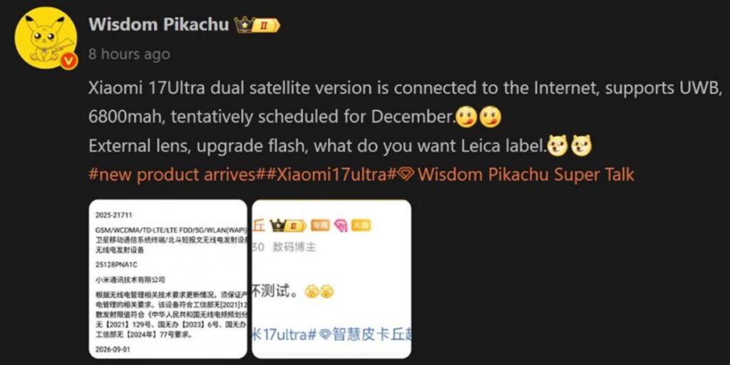 微博爆料人士 @SmartPikachu 提到,小米 17 Ultra 衛星版可能會在今年年底前正式推出,並配備大容量電池。這款型號為 25128PNA1C 的設備已通過中國無線電認證,確認是支援天通一號與北斗系統的衛星通訊版本,而非普通機型。使用者將能透過衛星進行通話,或收發衛星訊息。