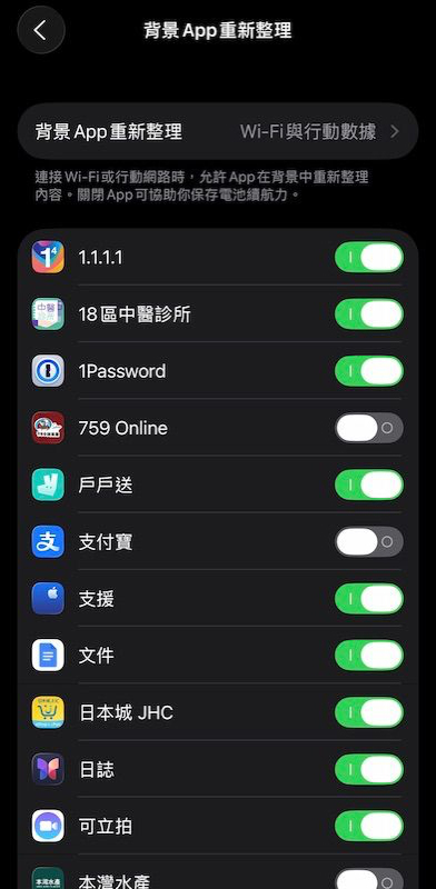 另一個可能影響 iPhone 網絡表現的功能是 Background App Res Refresh 背景 App 重新整理,如果有很多 App 在背景下載或串流資料,例如地圖導航、相片備份等等,當然會影響手機上網玩網絡遊戲的表現。大家應該定期到「設定>一般>背景 App 重新整理」頁面,重新審視哪些 App 有機會經常擅自下載內容,關閉它們的背景 App 重新整理功能。