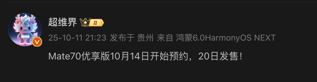 數碼博主「超維界」日前在微博帳號透露,HUAWEI Mate 70 優享版智能手機,最快在今日(14 日)開放預售、並於 10 月 20 日(下週一)開賣。
