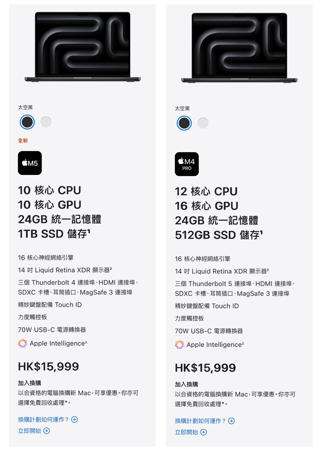 MacBook ProM5 的售價由12,999 港元起,配備16GB 記憶體和 512GB SSD,升級到 24GB 記憶體及 1TB SSD,售價為 15,999 港元,同價位可以買到 12 核 CPU / 16 核 GPU M4 Pro,配備 24GB 記憶體和 512GB SSD,更快的記憶體頻寛 (153GB/s vs 273GB/s) 以及Thunderbolt 5 的型號,在效能和容量之間,你又會如何選擇?