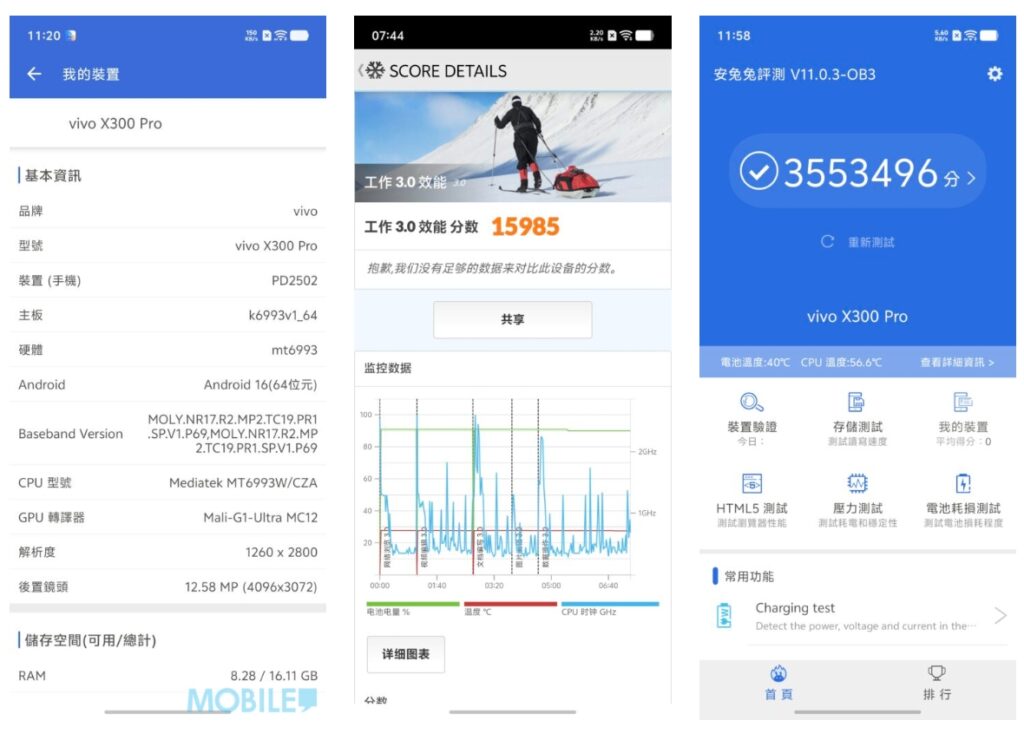 核心性能方面,X300 Pro 首發搭載聯發科最新 3nm 製程的 Dimensity 9500 旗艦晶片。這顆採用「全大核」設計的處理器,配備 1+3+4 核心架構,其中主核心時脈高達 4.21GHz。實測安兔兔 V11 跑分輕鬆突破 350 萬大關,無論是日常使用還是重度遊戲,都能提供流暢無阻的體驗。