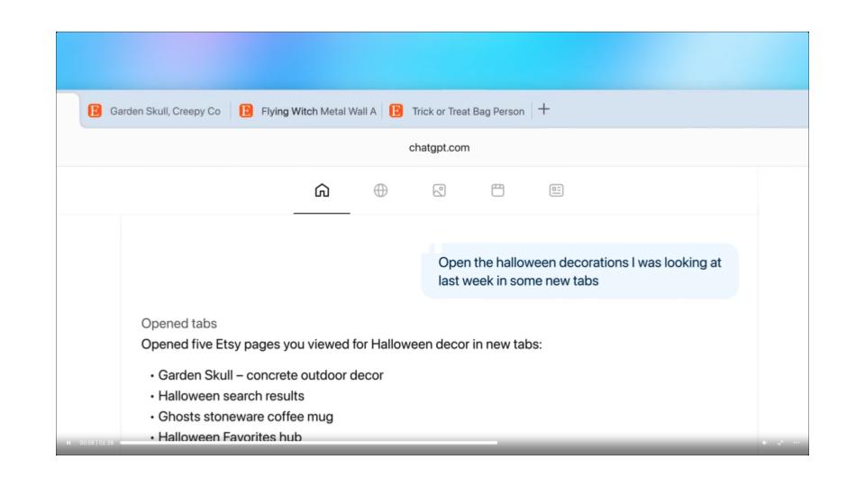 Atlas的AI代理模式(Agent Mode)能直接代用戶執行各類網絡任務,包括預訂餐廳、填購物車、填寫表格等實際操作,如配備專屬數位助理,可自動完成研究分析、行程規劃等重複性工作,用戶只需作最終確認。目前代理模式優先開放予ChatGPT Plus、Pro及Business用戶使用,未來將逐步擴大開放範圍。